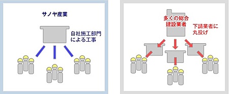 その秘密は組織形態にあります。多くの総合建設業者は工事の受注と施工管理を請け負うものの、肝心の工事は下請業者に流してしまいます。下請業者からすれば営業力が無い為、仕事の紹介はありがたい話です。マージンが高くても工事を引き受けるのです。最終的にそのマージンは消費者の負担となってしまいますので良心的価格の実現は不可能です。