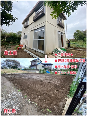 ●隣家との境界が高低差がかなりあったので、土が流れ出る恐れがありましたが、解体前に土を敷地内に寄せ解体を行いました。