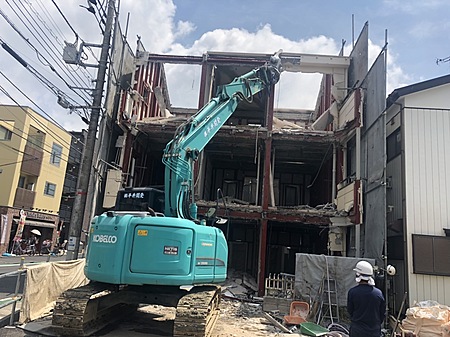 隣地との距離が少ない為、解体建物の壁を倒す際、ゆっくり正確に施工した。