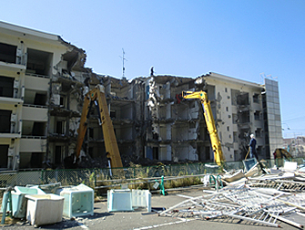 5階建て鉄筋コンクリート造の社宅解体工事を行いました。今回の工事では内装の一部にアスベストが使用されており、解体を始める前に先行してアスベストの撤去を行いました。作業場所からアスベストが外に漏れないようにしっかりと密封し、その後諸官庁の立会い検査を行います。養生に問題がないことを確認し、合格をもらってから撤去を開始します。建物の解体は前面の駐車場が広いことと、近隣の建物と距離が離れており作業がしやすかった為、順調に解体が進みました。