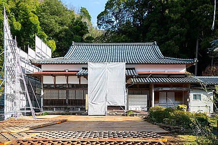 隣地に墓と民家があるため、施主様と相談し、必要ないという檀家様の意見もある中、大きめに足場養生する。
