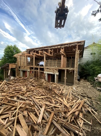 母屋は施主様が住んでいるため、お隣様の空き家の細い道を進み、山を削り、ブロック塀を壊し裏からの進入でとても難易度が高い現場でしたが、綺麗な状態で完工致しました。
