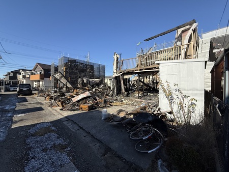 火災により3棟の建物がほぼ全焼した現場にて、